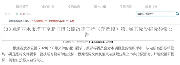 据悉,由于涉黑涉恶,经中央扫黑除恶第11督导组有关领导批示督办后,范大地被庆元县公安局逮捕,现法院已判决其有期徒刑。然而,范大地虽然人已经进了牢房,但他的愿望却依然可以实现。2020年6月28日,浙江省发改委在其官方网站上悍然发布了《330国道丽水市塔下至腊口段公路改建工程(莲都段)第1施工标段招标异常公告》,该公告称:“根据浙发改公管[2020]198号文件的通知要求,原评标委员会对本项目重新组织评审,认定所有投标单位均不满足招标文件要求,否决所有投标单位投标,根据招标文件及相关法规规定终止本次招标活动,并组织重新招标,请潜在投标人自行关注。”