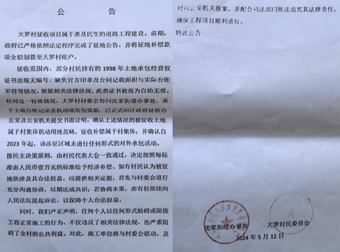 据村民们介绍,大罗村村民手中的水田至今已耕种了几十年,期间交过政府公粮、农业税、提留统筹等,村民手中还有国家发放的纳税通知书。在98年国家第二轮土地确权时,村民的水田被确权,并取得了《土地经营权证书》,村民还享受国家惠农补贴、粮补、植补等,村民们往复耕种,但这一切却被一条道路打破了——2022年,哈尔滨开始修建都市圈环线五环路项目工程,村书记王厂良在村民们不知情的情况下,带领环线北环永源至双井段工程项目部施工人员进入村民耕种的承包地里施工,村民才发现自己的土地被政府征收了。村民们了解后才得知,在2023年11月10日,村书记王广良曾经以开村民代表大会的名义会同沈家街道发出联合公告,把村民的5000多亩水田承包地变成了村集体的机动地。但让村民们质疑的是,这些村民代表都是王广良指认的亲朋好友,并不是由全体村民选举产生的,不能代表村民的集体利益。更让村民们不解的是,大罗村水田和旱田总共才9000亩,《土地法》第六十三条明确规定村集体机动地不能超过村集体总面积的5%,超过5%不得再增加机动地。大罗村的5000多亩村民承包地怎么就突然变成了机动地?并在村民不知情的情况下被政府征收的?村民们十分不解。