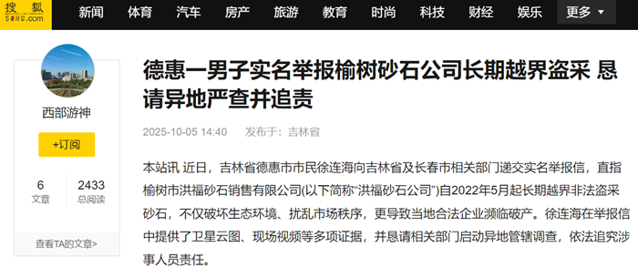 本站讯 近日,吉林省德惠市市民徐连海向吉林省及长春市相关部门递交实名举报信,直指榆树市洪福砂石销售有限公司(以下简称“洪福砂石公司”)自2022年5月起长期越界非法盗采砂石,不仅破坏生态环境、扰乱市场秩序,更导致当地合法企业濒临破产。徐连海在举报信中提供了卫星云图、现场视频等多项证据,并恳请相关部门启动异地管辖调查,依法追究涉事人员责任。