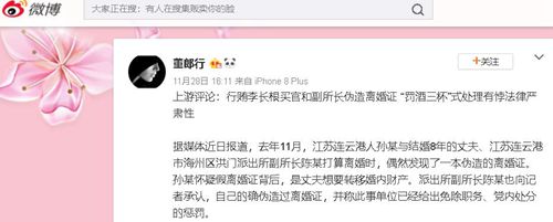 据媒体近日报道,去年11月,江苏连云港人孙某与结婚8年的丈夫、江苏连云港市海州区洪门派出所副所长陈某打算离婚时,偶然发现了一本伪造的离婚证。孙某怀疑假离婚证背后,是丈夫想要转移婚内财产。派出所副所长陈某也向记者承认,自己的确伪造过离婚证,并称此事单位已经给出免除职务、党内处分的惩罚。
