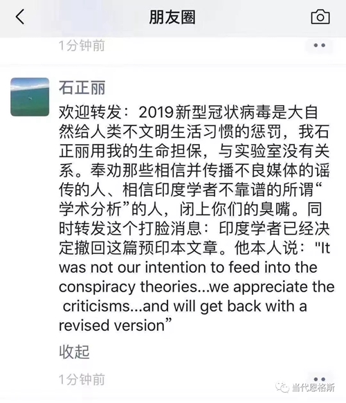 由于一些谣言的出现,石正丽女士最近发朋友圈进行了驳斥: