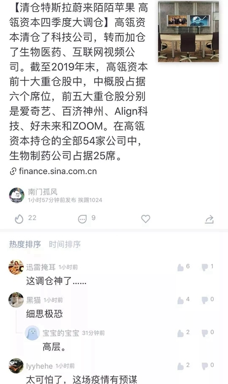 “高瓴资本是美国在华最大的基金运作公司,在疫情爆发前准确加仓生物制药企业,目前其持仓的54家企业中,生物制药占据了25席。值得特别关注的是,第一重仓股是疫情期间最大获利者——视频平台爱奇艺;第二重仓股是生物制药的百济神州;不仅如此,高瓴资本还将远程办公的ZOOM列为其第五大重仓股,准确得令人可怕!”