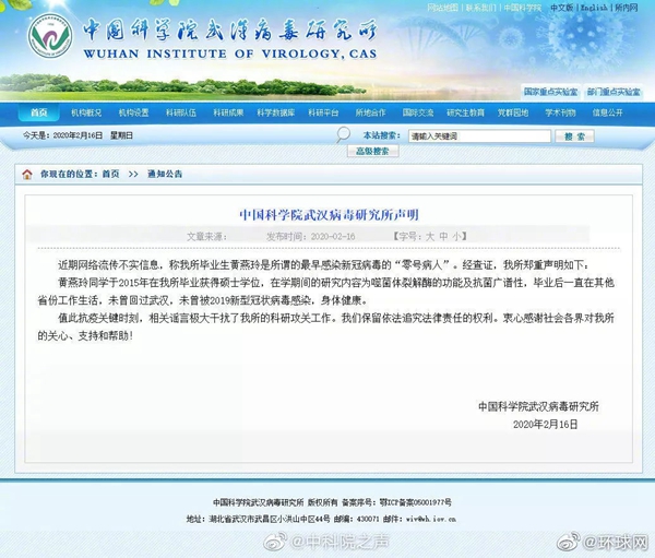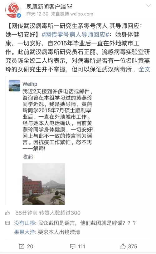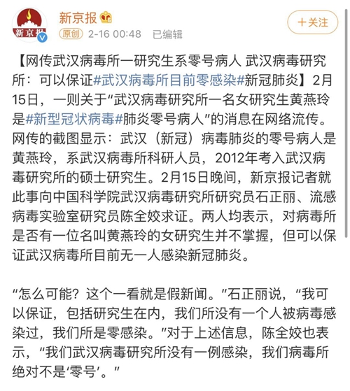 第一次澄清来自武汉病毒研究所的石正丽,她用了教科书式的最糟糕辟谣方式:“我可以保证它是假的”
