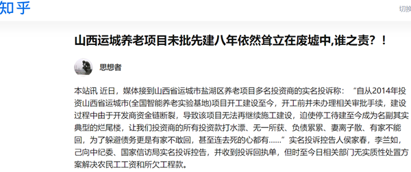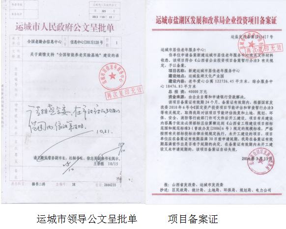2015年,各大新闻媒体在接到投资商及农民工实名投诉后,媒体前往山西省运城市盐湖区,实地了解《全国智能养老实验基地》项目,当时该项目的审批手续存在很大争议。调查发现该项目根本就没有审批,也就是说从2014年开工至2015年媒体监督时是没有合法的审批手续。当时明知该养老项目没有合法审批手续,那么全国智能养老实验基地开工典礼仪上为什么又有运城市委、政府及盐湖区相关领导人参加?难道相关政府领导及部门领导是真不知道该项目属未批先建吗?完全不符情理吧?最后,在舆论监督下,盐湖区政府领导会同相关部门才将该项目的审批手续审批结束,使未批先建的全国智能养老实验基地项目合法化。
