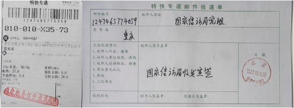 上图:向国家信访局,中纪委实名信访投诉回执单