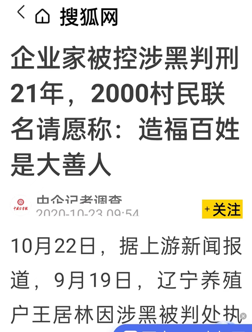 记者手记:依靠水产养殖起家,后发展到二十几家企业的王居林,被打成“黑老大”并判刑二十一年的新闻已过去两年多了。这两年来,有件疑惑的事一直在记者的心头挥之不去,那就是王居林被判刑不久,从他出生一直到被打成“黑老大”的辽宁营口盖州市归州镇的2000多村民,竟然按上大红手印为其鸣不平。刹那间,网络上有关“辽宁企业家因涉黑获刑21年 2000余村民联名请愿称未被欺压”的报道层出不穷,甚至一度冲上了微博热搜榜第六名,数万人对报道进行留言,认为这起涉黑案的背后一定有很多不为人知的事实存在,本记者也了解到案件中存有诸多疑点。