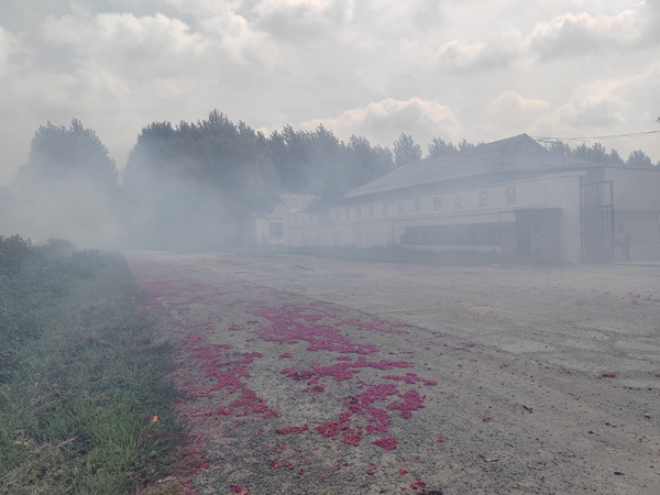 上午9时58分,吉林省宏伟烟花爆竹有限责任公司提货仓库和销售样品门口一条路两旁爆竹分列成500米“长龙”。紧随一声“点火”指令发出,火爆的“开门红”、“满堂红”、“吉祥如意”爆发出两条喷火吐烟长龙。最令人惊悚的还不止这些,燃放点距离仓库不足20米,仅仅有一墙之隔,爆竹炸响溅起的火星和碎屑有2米多高。