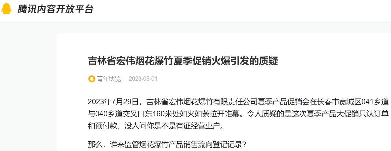2023年7月29日,吉林省宏伟烟花爆竹有限责任公司夏季产品促销会在长春市宽城区041乡道与040乡道交叉口东160米处如火如荼拉开帷幕。令人质疑的是这次夏季产品大促销只认订单和预付款,没人问你是不是有证经营业户。