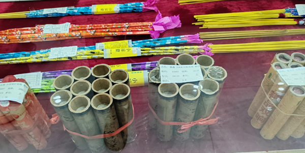 除此之外,在销售样品大厅内,各类涉嫌超标、超药量的烟花爆竹(无药样品)琳琅满目。在一进大厅中央一个玻璃展柜里展出的“双响”尚未标注无药样品,一款编号“02603”型号“000180|”双响直径1.5寸,另一款编号“20086”、型号“000131”双响直径2寸均未标注无药样品。