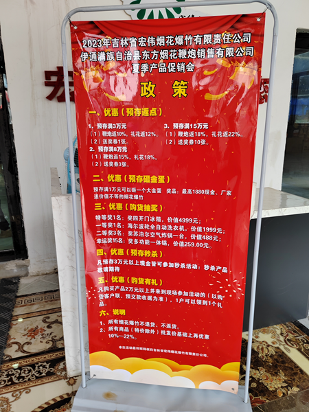 图为:吉林省宏伟烟花爆竹有限责任公司夏季产品促销会返利、返点、有奖销售政策出台。