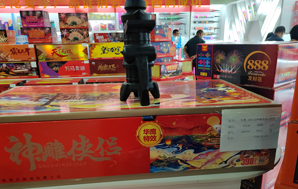 大厅内罗列的烟花爆竹品种种类让人目不暇接、眼花缭乱,其中,一款叫做:编号“14146”、型号“000600”烟花最抢眼,该款为398发华鹰“神雕侠侣”特效烟花,售价4788元。这款烟花外包装已经标注“无药样品”。可想而知,这款超量烟花要是实品呈现需要两个成年人合力抬着搬运。