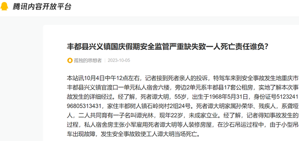 本站讯10月4日中午12点左右,记者接到死者亲人的投诉,特驾车来到安全事故发生地重庆市丰都县兴义镇官渡口一单元私人宿舍六楼,旁边2单元系丰都县17套公租房,实地了解本次事故发生的详细经过。经了解,死者谭大明,55岁,出生于1968年5月31日,身份证号512324196805313431,家住丰都树人镇石岭岗村2组24号。死者谭大明家属孙荣华、残疾人,系聋哑人,二人共同育有一子名叫谭光林,现年22岁,未成家立业。经了解,记者得知事故发生的过程,私人宿舍房主张小军雇用死者谭大明等人装修房屋,在沙石吊运过程中,由于小型吊车出现故障,发生安全事故致使工人谭大明当场死亡。