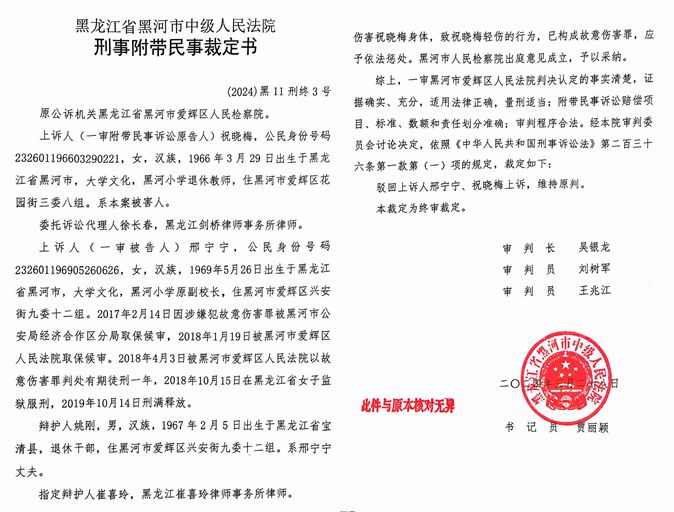 且看爱辉区法院是如何重新判决的。据黑河市中级法院2024黑11刑终3号刑事附带民事裁定书记载:一审爱辉区法院判决认定,2015年6月29日9时45分许,时任黑河小学副校长被告人邢宁宁到该校教师被害人祝晓梅的办公室,要求祝晓梅按照学校教学安排串课,引起祝晓梅的不满。后邢宁宁将祝晓梅叫至自己办公室,二人发生激烈争吵,随后祝晓梅被闻声而来的教师李某等人劝回。9时47分许,祝晓梅再次到邢宁宁办公室,李某见状跟随祝晓梅进入该办公室。邢宁宁和祝晓梅再次发生激烈争吵并相互撕扯,祝晓梅将邢宁宁办公桌上的书本扔撇在地上,邢宁宁用手推祝晓梅胸部一下,祝晓梅倒地昏迷。后祝晓梅被送往医院救治。次日,祝晓梅丈夫刘福电话报警。经黑河市公安局刑事技术支队鉴定:祝晓梅脊髓损伤属轻伤一级;脊髓损伤后一年半,现遗留肢体肌力减弱属伤残五级。2017年2月14日,邢宁宁被公安机关传唤到案。
