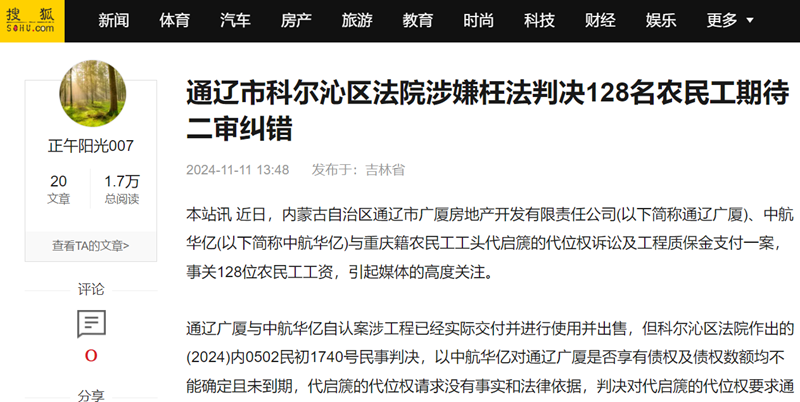 本站讯 近日,内蒙古自治区通辽市广厦房地产开发有限责任公司(以下简称通辽广厦)、中航华亿(以下简称中航华亿)与重庆籍农民工工头代启篪的代位权诉讼及工程质保金支付一案,事关128位农民工工资,引起媒体的高度关注。
