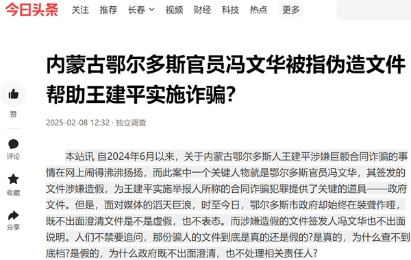 本站讯 自2024年6月以来,关于内蒙古鄂尔多斯人王建平涉嫌巨额合同诈骗的事情在网上闹得沸沸扬扬,而此案中一个关键人物就是鄂尔多斯官员冯文华,其签发的文件涉嫌造假,为王建平实施举报人所称的合同诈骗犯罪提供了关键的道具——政府文件。但是,面对媒体的滔天巨浪,时至今日,鄂尔多斯市政府却始终在装聋作哑,既不出面澄清文件是不是虚假,也不表态。而涉嫌造假的文件签发人冯文华也不出面说明。人们不禁要追问,那份骗人的文件到底是真的还是假的?是真的,为什么查不到底档?是假的,为什么政府既不出面澄清,也不处理相关责任人?