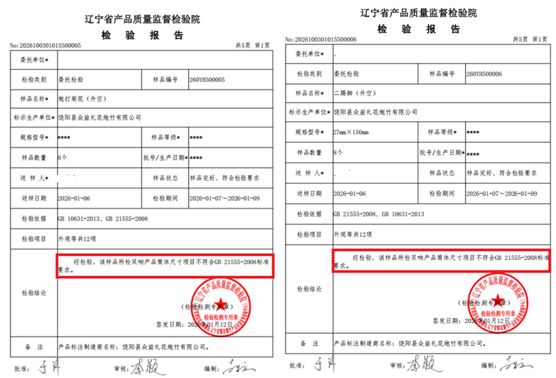 2016年1月12日,据辽宁省消防技术监测站、辽宁省烟花爆竹产品质量监督检验中心《检验报告》显示:共检测河北省饶阳县众益礼花炮竹有限公司和饶阳县御红祥烟花爆竹有限公司生产跨省销售的7个产品,别是“二踢脚”(升空)、“无敌双响炮”(升空)、“特制双响炮”(升空)“炮打菊花”(升空),“精制双响”(升空)“开门红”(组合烟花)“红红火火”(组合烟花)”等7款产品。其中,有2个产品合格: