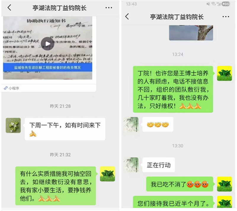 十年来,张继祥耗尽家财、负债累累,为维权奔走各地,而亭湖法院的敷衍塞责,始终没有改变。该院副院长王浪曾在2020年9月3日与张继祥的通话中,轻描淡写地称维权者没法“搬砖砸天”,还将法院冻结状态下被他人划转的款项无端称为“投资有风险”;该院党组书记、院长丁益钧长达两年多的温情敷衍,乃至2026年1月上旬,丁益钧与分管民事审判和刑事审判的两位副院长一同约见张继祥,郑重承诺“马上办”,最终也成了空头支票。一次次的承诺与落空,让张继祥对亭湖法院相关工作人员的诚信,彻底失去了信任。