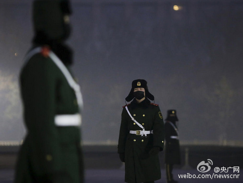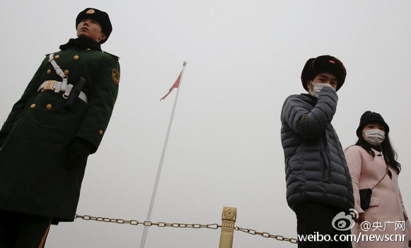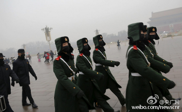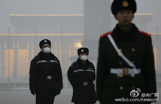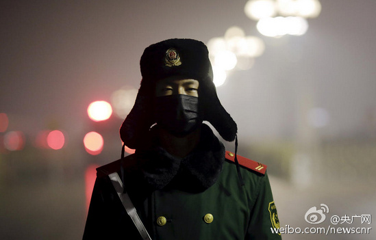 12月9日,在天安门广场执勤的武警战士首次在雾霾天佩戴口罩执勤。8日开始,北京正式启动3年来首个重污染红色预警信号。根据北京市环保监测中心的最新预报显示,今天白天,北京污染水平将在区域背景下进一步上升,PM2.5浓度到达此次污染过程的峰值。 |