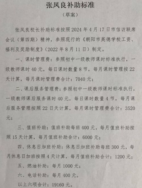 同年6月4日,朝阳市英德学校第四届理事会第三次会议讨论通过校长张凤良补助标准为每月19160元。