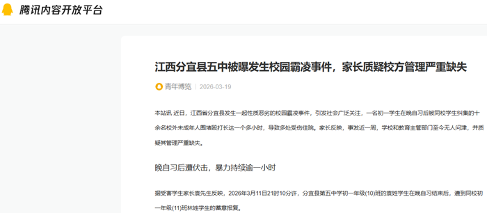 此外,就在本月(3月1日),新学期开学第一天,分宜县第五中学也曾发生一起纠集校外人员殴打学生的事件。家长痛心地表示,正是因为学校和主管部门的屡次漠视,才导致类似恶性事件接二连三地发生。