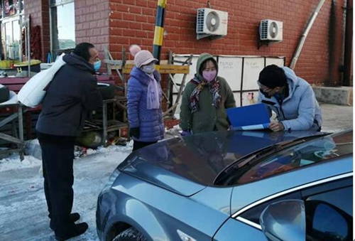 甘河农场志愿者在居民住宅小区门口疫情防控卡点排查登记。