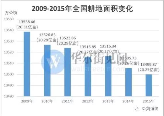 耕地面积少:改革开放后,由于经济建设需要,大量农耕地被用于厂房建设与开发。2009年~2015年六年间,中国耕地从20.31亿亩减少到20.25亿亩,平均每年减少近200万亩耕地。同年,美国耕地面积为23.2亿亩,比中国足足多出3亿亩。