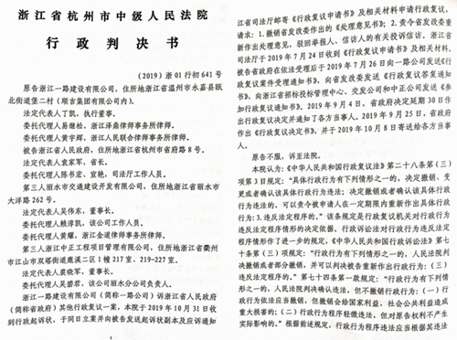 2020年3月20日,杭州市中级法院作出行政判决书认可了省政府行政复议决定书撤销省发改委处理意见的结论,同时在本院认为部分纠正和否定了省发改委认为一路公司业绩无效的认定。