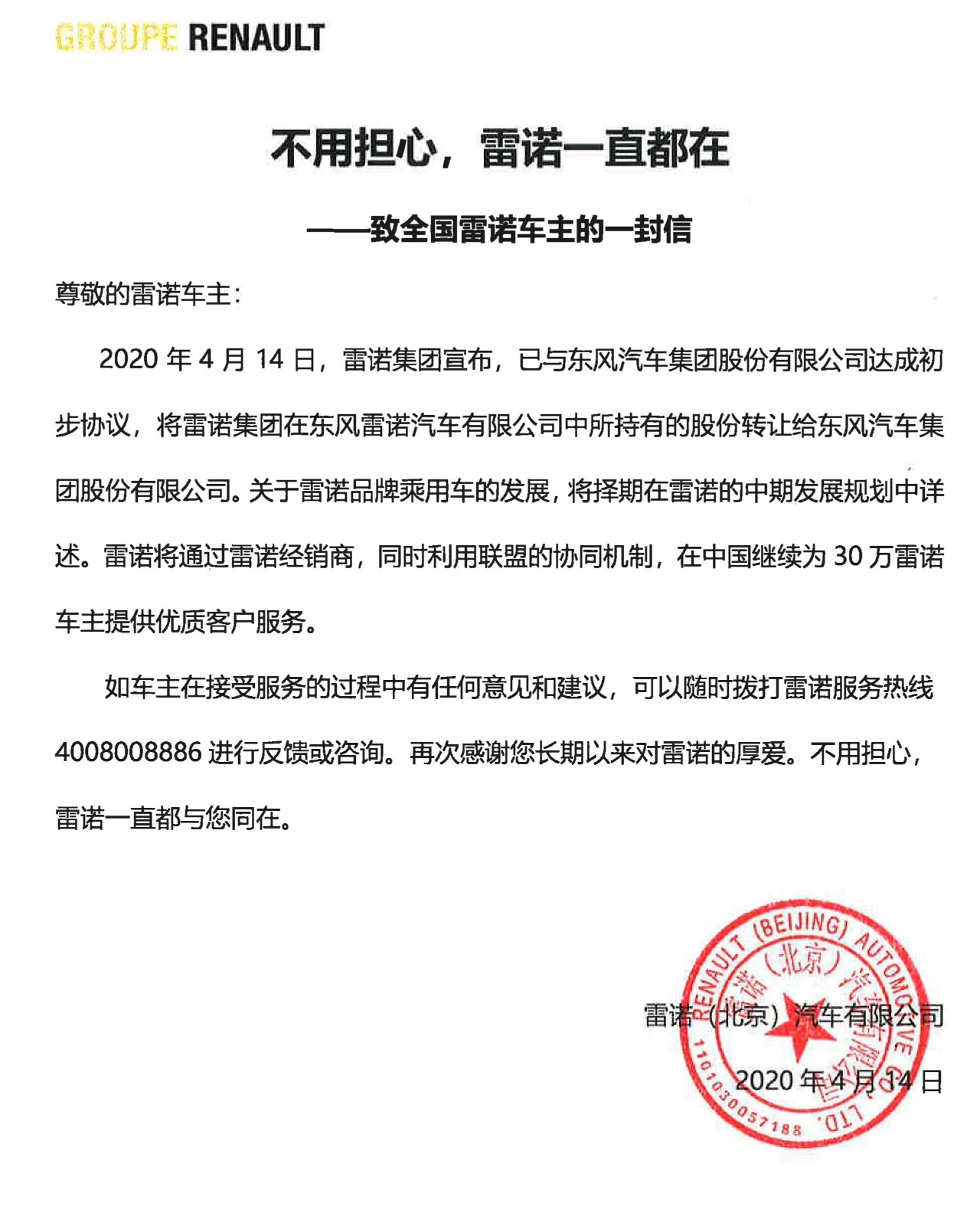 雷诺汽车致全国车主的一封信。