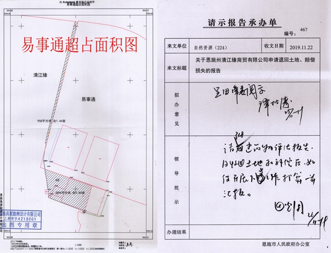 易事通超占面积图和恩施副市长田贵周签批收回项目请示报告承办单