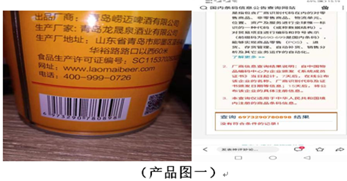 4月消费者陈先生,以一会所员工身份,来到青岛李沧区金水路一家名为青岛鑫德汇商贸有限公司洽谈采购业务,接待我们的是一男性员工,经过讨价还价,花了300元买到了崂迈黑啤、黄啤各一罐,10L礼品盒一箱以及1500ml塑料桶装黑啤一罐。根据举报者的描述,我们经过比对发现该品牌啤酒包装上的条形码使用违反食品安全法相关规定。