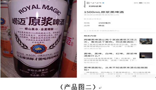 购买的一款标称为2021年1月1日产的净含量1L两发原浆啤酒条形码为6973290780898的产品,经国内条码信息公告查询网站查询结果为没有符合的记录,后经过产品码扫描,显示该条码无相关商品信息,又扫描产品正面“识物”,显示没有找到物品信息。