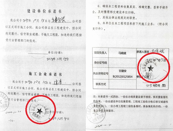 1、备案材料显示,施工单位的法人授权委托书存在弄虚作假问题,加盖的公章不是甘肃省安装建集团公司的公章,而是加盖的甘肃省安装建集团公司通化项目部的印章,不能认定为甘肃安建的授权。