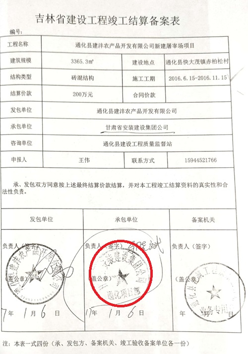 据介绍,2015年,通化县建沣农产品开发有限公司(简称建沣公司)要新建屠宰厂,甘肃省安装建设集团有限公司(简称甘肃安建)中标,但是甘肃安建并没有实际施工,也没有来人管理,而是将该工程直接转包给了他人。2015年9月9日,赵红石、王国新同通化建沣法人王伟签订施工协议;9月11日,赵红石、王国新组织施工人员、材料、机械进场,正式开始施工,到11 月末,由赵红石、王国新所承建的办公楼、厂房、地下净水池、地下蓄水池基本施工完毕;由实际施工人承建的,甲方后期扩大需要建设的暂养猪舍主体施工完毕,剩余圈梁、地面及部分水、电工程没有施工完毕; 2016年2 月5日,王伟给付实际施工人发放了农民工工资;同年5月10日,赵红石、王国新带领施工人员进场继续施工;2016年6月20日,赵、王二人承建的所有施工内容全部实施完毕。但通化建沣和甘肃安建却拖欠工程款拒不给付,于是,赵、王二人将此事诉至法院。在法院审理期间,赵、王发现了通化建沣和甘肃安建在新建屠宰厂项目涉嫌令人震惊的违规、违法的行为,遂向建委等部门实名举报。他们举报的内容主要如下: