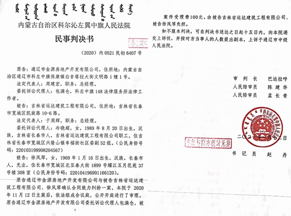 到2018年10月1日,吉地华府小区完工,但金源地产没有按合同约定履行给付义务,却屡屡在工程造价上做文章,竟想以收尾工程每平米1600的造价结算工程,于是双方产生纠纷。为了解决问题,科左中旗政法委书记莫日根巴特尔,要求双方到其办公室谈判。据徐凤琴介绍,该书记倾向每平米1600元,徐凤琴不认可,莫书记则明确表态,你们如果不认可我的意见,可以通过法院诉讼解决,结果在科左中旗法院引发了一场诉讼。第一次诉讼,2020年10月份,金源地产在科左中旗法院起诉徐凤琴工程单价每平米1600元。在法院开庭时,开发商未到庭参加诉讼,科左中旗法院下达了(2020)内0521民初996号民裁定书,按原告金源地产自动撤诉处理。开发商又提起第二次诉讼,诉讼请求与前诉相同,开庭时,徐凤琴向科左中旗法院提供了通辽市中级人民法院(2019)内05民初20号民事判决书,该判决书在法院认定事实部分认定了工程单价每平米1700元。可是科左中旗法院法官巴达拉呼罔顾事实,公然对抗上级法院判决,悍然下达了(2020)内0521民初6407民事判决书,判决工程单价每平米1600元,做出这一判决的法官正是法官巴达拉呼。令人感到怪异的是,这份判决书下达后并没有给徐凤琴送达。徐凤琴因此怀疑,在此次诉讼的幕后,疑似有一只黑手操纵。