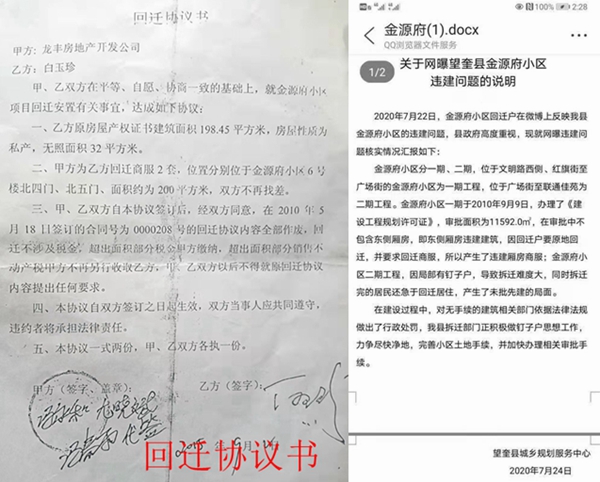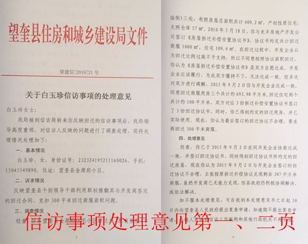 据老人介绍:2010年,她与开发商龙丰公司签订了安置补偿协议书。到了2011年,房子建成了,开发商却不予回迁。从2012年起,她就开始找县领导上访,但无果,某领导竟然对她说:“不要和我说合同”。到了2015年9月份,眼看回迁无望了,她只好忍气吞声的与开发商签了回迁协议,但回迁面积却少了三百平米。她无奈之下又开始上访。在她的上访下,望奎县住建局于2018年7月12日做出《关于白玉珍信访事项的处理意见》(望建信[2018]21号),答复称政府正在“积极协调解决”,可是随后便没有了动静。