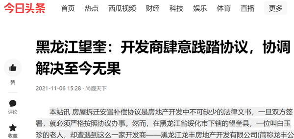 本站讯 房屋拆迁安置补偿协议是房地产开发中不可缺少的法律文书,一旦双方签署,就必须严格按照协议办事。然而,在黑龙江省绥化市下辖的望奎县,一位叫白玉珍的老人,却遭遇到这么一家开发商——黑龙江龙丰房地产开发有限公司(简称龙丰公司),拆迁安置补偿协议签完、房子也建完了,却后悔了,居然硬是少给老人300平米房子。老人找县政府官员想要个说法,一位前任县长居然声称:“开发商利益要最大化”,“不要和我说合同”!直到2018年7月,望奎县住房和城乡建设局(简称住建局)才做出信访处理意见,称政府正在“积极协调解决”,然而三年多过去了,仍然没有任何结果。老人不禁感概:照这样“协调”下去,不知道这辈子还能不能要回来自己的房子。
