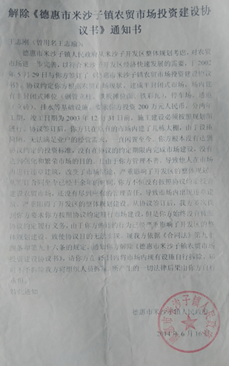 2014年6月16日,米沙子镇政府以王志刚“没有达到协议约定的投资标准、没有在协议约定的期限内完成市场建设、没有达到强化和繁荣市场的目的、市场出现了违章建筑、改变市场用途、致使协议目的无法实现等”为由,制作了《解除【德惠市米沙子镇农贸市场投资建设协议书】通知书》向王志刚送达。