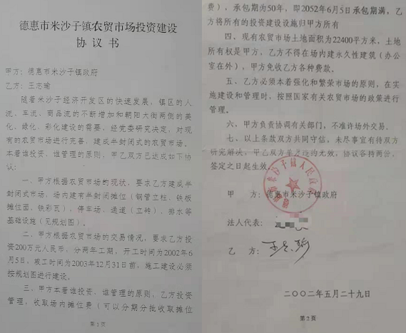 2002年5月29日,王志刚与米沙子镇政府签订了《德惠市米沙子镇农贸市场投资建设协议书》,协议书约定:由米沙子镇政府提供土地,由王志刚两年内出资200万投建该市场并由其管理,合同期限为50年。自此,王志刚取得了原市场地块的23716平方米土地的使用权。