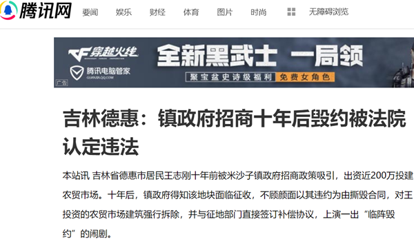 本站讯 吉林省德惠市居民王志刚十年前被米沙子镇政府招商政策吸引,出资近200万投建农贸市场。十年后,镇政府得知该地块面临征收,不顾颜面以其违约为由撕毁合同,对王投资的农贸市场建筑强行拆除,并与征地部门直接签订补偿协议,上演一出“临阵毁约”的闹剧。