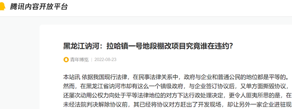 本站讯 依据我国现行法律,在民事法律关系中,政府与企业和普通公民的地位都是平等的。然而,在黑龙江省讷河市却有这么一个镇级政府,与企业签订协议后,又单方面撕毁协议,还屡次动用公权力向处于平等法律地位的对方下达行政处理决定,更令人匪夷所思的是,在未经法院判决解除协议前,其已经将协议对方赶出了开发现场,却让另外一家企业进驻现场......