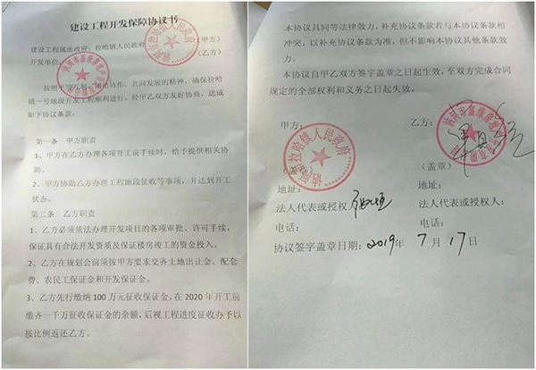 然而到了2016年6月,形势开始突变,拉哈镇党委、镇政府居然在一次会议上公开宣称一号地块项目与拉哈镇政府无关,属于开发商个人行为,政府不承担任何责任,致使讷河市拆迁办的工作无法进行下去。从2017至2019年三年期间,已动迁的老百姓多次上访,政府迫于压力2019年7月,在时任镇长张恒、副镇长岳永杰的推动下,嘉缘公司与拉哈镇政府就一号地块项目建设签订了《建设工程开发保障协议书》。