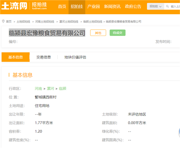 小编在临颍县政府网进行了查询,并未查询到关于繁城镇粮所土地的拍卖信息。值得一提的是,临颍县宏豫粮食贸易有限公司成立于2014年9月3日,也就是说该公司刚成立就拿到了粮所土地进行开发。而招拍挂信息网上关于临颍县宏豫粮食贸易有限公司的招拍信息也是空白。