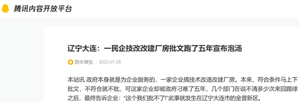 本站讯 政府本身就是为企业服务的,一家企业搞技术改造改建厂房。本来,符合条件马上下批文,不符合就不批,可这家企业却被政府刁难了五年,几个部门在说不清多少次来回踢球之后,最终告诉企业:“这个我们批不了!”此事就发生在辽宁大连市的金普新区。