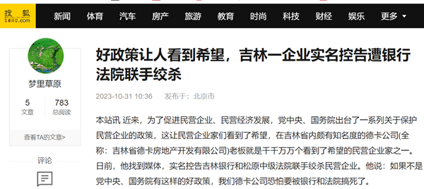 本站讯 近来,为了促进民营企业、民营经济发展,党中央、国务院出台了一系列关于保护民营企业的政策,这让民营企业家们看到了希望,在吉林省内颇有知名度的德卡公司(全称:吉林省德卡房地产开发有限公司)老板就是千千万万个看到了希望的民营企业家之一。日前,他找到媒体,实名控告吉林银行和松原中级法院联手绞杀民营企业。他说:如果不是党中央、国务院有这样的好政策,我们德卡公司恐怕要被银行和法院搞死了。