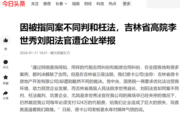 “通过网络查询得知,同样的代租合同纠纷和租房合同纠纷,在全国各地有很多案例,都判决解除了合同。但是在吉林省三级法院,我们德卡公司(全称:吉林省德卡房地产开发有限公司)却遭到截然不同的裁决。党中央、国务院一再要求优化法治营商环境,助力民营企业发展,而吉林省高级人民法院李世秀庭长、刘阳法官却同案不同判、枉法裁判、坑害企业,尤其是李世秀法官在我公司的商场早已经关停的情况下,仍然裁定我公司每年必须支付324万的代租费,给我们企业造成了巨大的损失,简直就是逼着我们跳楼。”日前,德卡公司老板姜永库对媒体气愤的说。