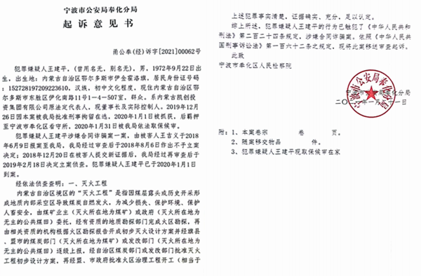 宁波市公安局奉化分局的起诉意见书(甬公奉[经]诉字[2021]00062号)认定:1.王建平在案发时已陷入严重资金困局的情形下,在其本人和凯创公司未实际取得政府煤炭资源配置的前提下,向被害人王吉义和其他人谎称拥有政府配置的位于二道柳地区的且三个月短期内可实施开工的灭火工程煤炭资源,通过签订根本不可能实现的“灭火工程合作施工协议书”为形式的合同,非法占有巨额资金,涉嫌合同诈骗罪。2.海伊奎技改煤矿总体面积只有1368亩,后期批复的灭火工程不可能超出煤矿总体面积,案发时还在履行灭火工程批复手续中且短期内不可能取得开工令的实际情形下,王建平向本案被害人王吉义和其他人谎称可马上开工,并大肆签订海伊奎煤矿的“灭火工程施工协议书”或“转让开采收益权协议书”等各类形式的合同,非法占有大量资金,涉嫌合同诈骗罪。