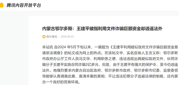 本站讯 自2024 年5月下旬以来,一篇题为《王建平利用疑似政府文件诈骗巨额资金恳请依法调查》的帖文成为网上的热点。在该帖文中,实名反映人王吉义称:鄂尔多斯市政府办公厅工作人员冯文华,利用职务之便,违法违规出具疑似政府文件,伙同诈骗分子王建平实施合同诈骗2亿多元,但是,由于王建平有强大的保护伞,至今仍逍遥法外。他强烈要求内蒙古自治区政府、鄂尔多斯市政府、鄂尔多斯市纪委、监察委领导能够认真调查此案,查清本案的真相,不让违法犯罪分子逃避法律的制裁,还内蒙古一个良好的营商环境。