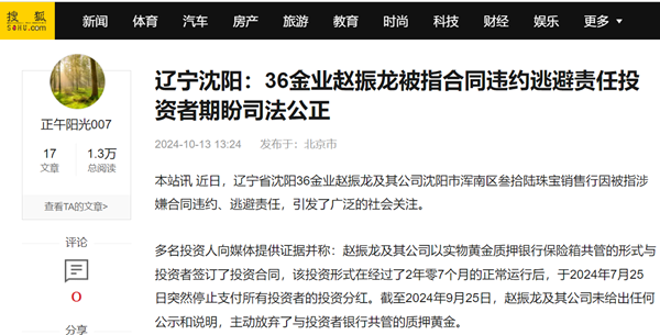 本站讯 近日,辽宁省沈阳36金业赵振龙及其公司沈阳市浑南区叁拾陆珠宝销售行因被指涉嫌合同违约、逃避责任,引发了广泛的社会关注。
