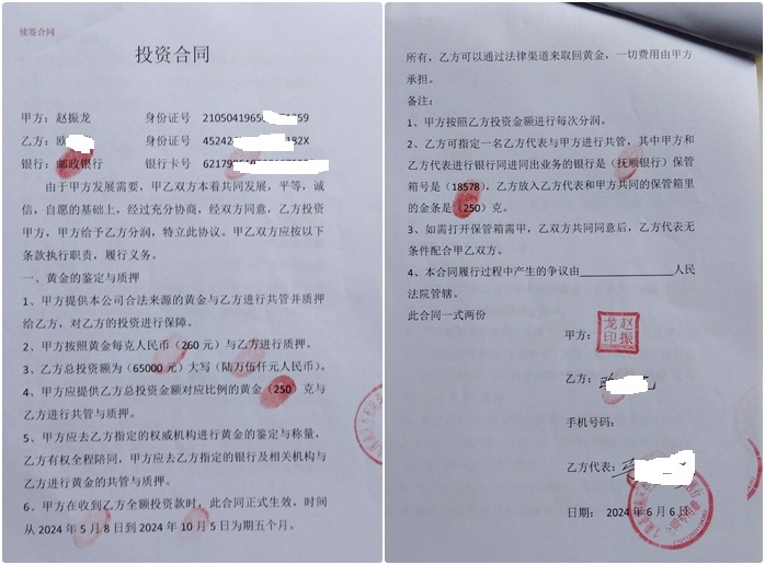 36金业的发展过程也备受关注。据介绍,赵振龙在两年半的时间内共开设了四家企业,包括沈阳市大东区腾博金银珠宝行、沈阳市浑南区叁拾陆珠宝销售行等。他以国家政策藏金于民、宣传打造中国北方黄金交易所的旗号,让投资者看到了希望。尤其是他以现货黄金260元/克的超低价格质押与投资者银行共管,更是吸引了大量投资者的关注。然而,从2024年7月25日开始,赵振龙及其公司却违反了合同约定,停止支付投资者的投资分红。