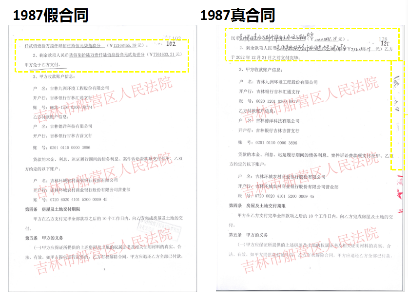 吉林省船营区法院在判决书中称:本院认为,根据确认的案件事实,本案的争议焦点为:九洲公司与德洋公司签订的两份《房屋及土地买卖合同》的效力问题。“合同1”载明出售价格为12108455.79元,“合同2”载明出售价格为19870089元,已支付12108455.79元,剩余款项人民币7761633.21元,乙方于2022年12月31日前支付完毕。本案中,案涉5处房屋进行拍卖的事实基础为九洲公司为了履行吉林市中院判决书确定的给付义务,而有将房屋出售并将变卖价款交付环城商业银行的意思表示,基于此,九洲公司与德洋公司达成买卖案涉5处房屋的意思表示,根据德洋公司提供的转账记录,可以确定其分四次代九洲公司履行了向环城商业银行支付欠款的义务,支付金额为12108455.79元。若双方真实意思表示价款19870089元,则九洲公司与德洋公司没有必要签订价款为12108455.79元的“合同1”,对于此事实,德洋公司辩称因双方交易价格低于评估价格,税务机构要求按照评估价格缴纳税费故而签订的价格为19870089元的合同,该解释更符合常理和交易习惯;在生效判决已作出,即将被执行的背景下,若德洋公司未替九洲公司履行义务,九洲公司即将面临案涉房屋被法院拍卖的情况,德洋公司以九洲公司欠付款项12108455.79元为对价购买案涉房屋更符合常理;且从合同签订是时间看,评估报告作出的时间为2021年2月9日,故“合同2”时间签订时间应为2021年2月9日之后,九洲公司解释双方签订的交易价格为“合同2”,为了减少税费又签了“合同1”,这与上述两份合同签订的时间相背,故对九洲公司的意见不予采纳。